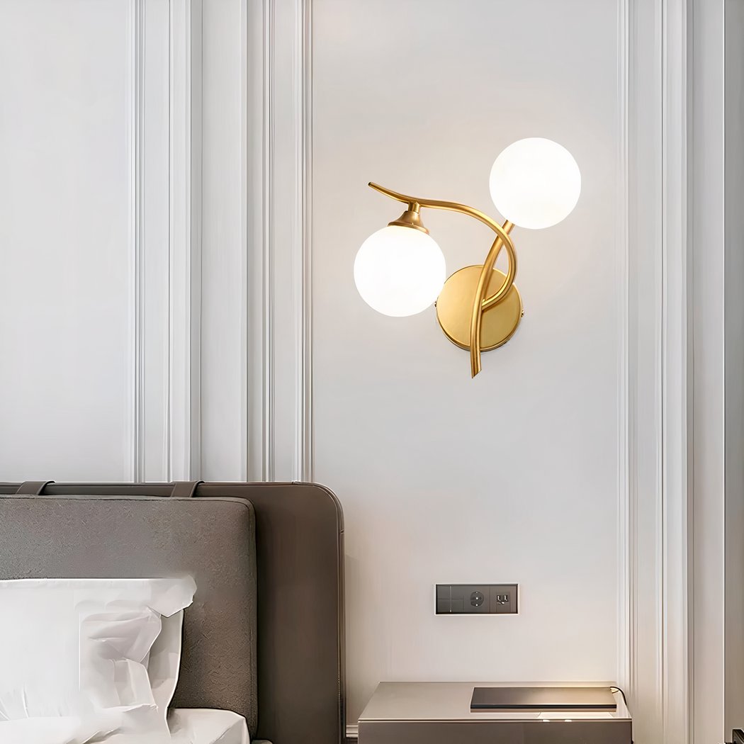 Diese Wandleuchte ist das ideale Stück, das Leuchten mit modernem Design repräsentiert. Mit ihren eleganten und abstrakten goldenen Kurven wird sie mit zwei Leuchtkugeln kombiniert.