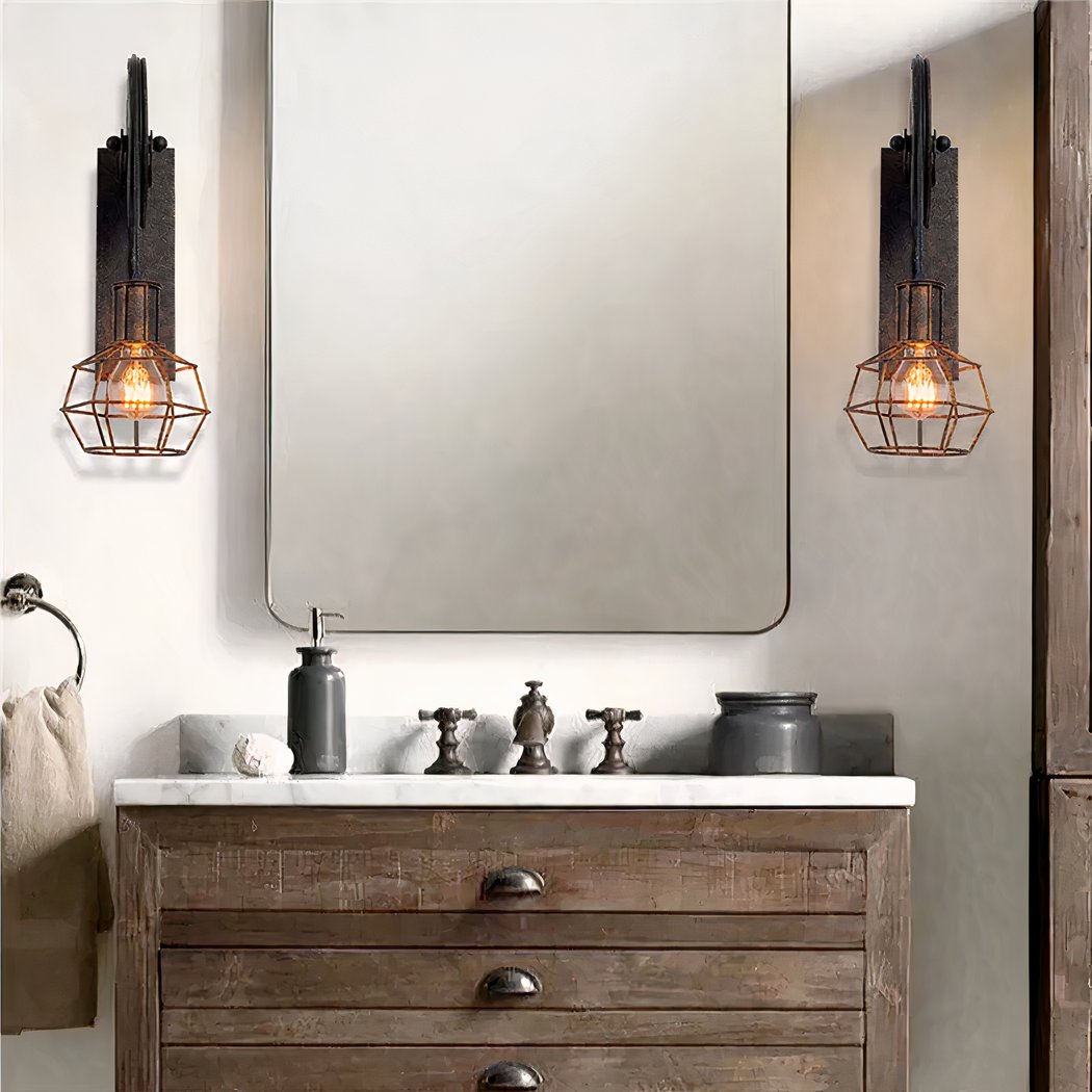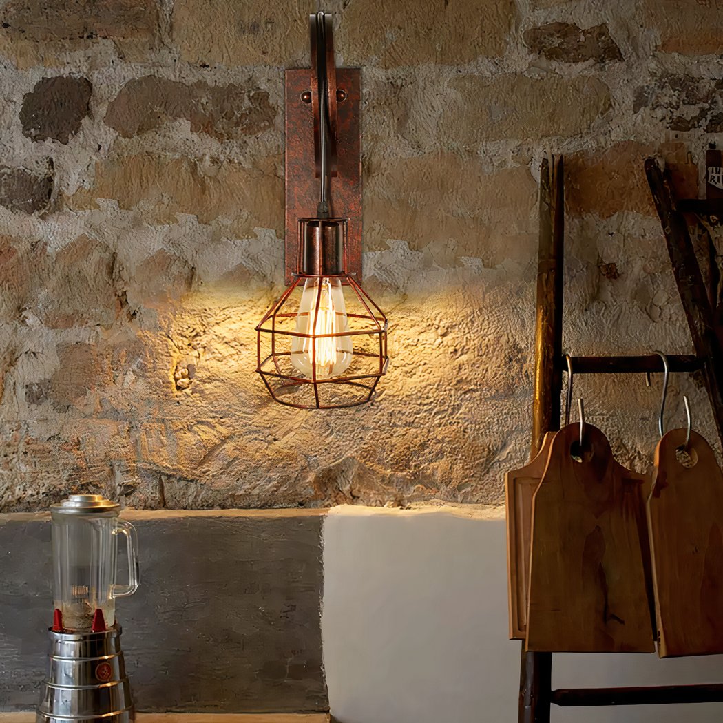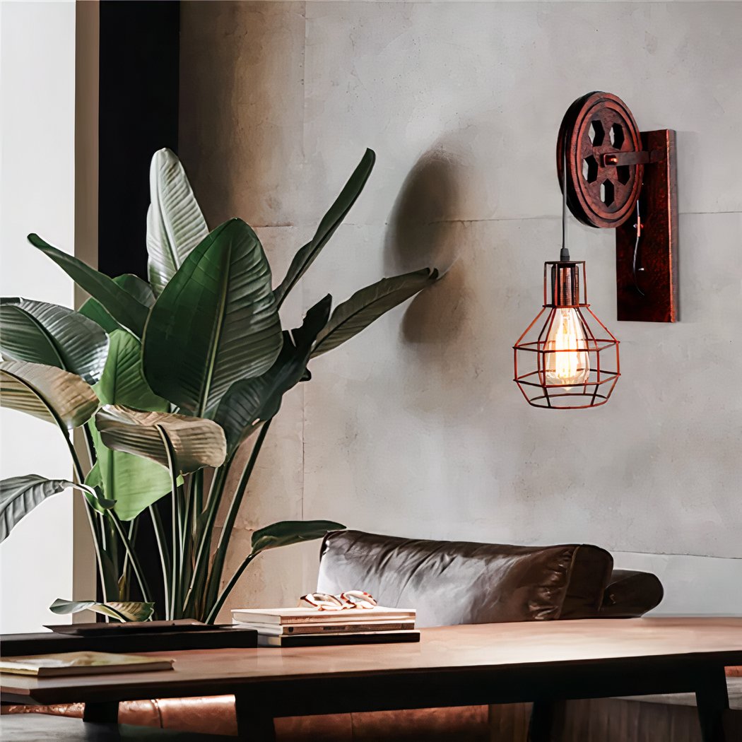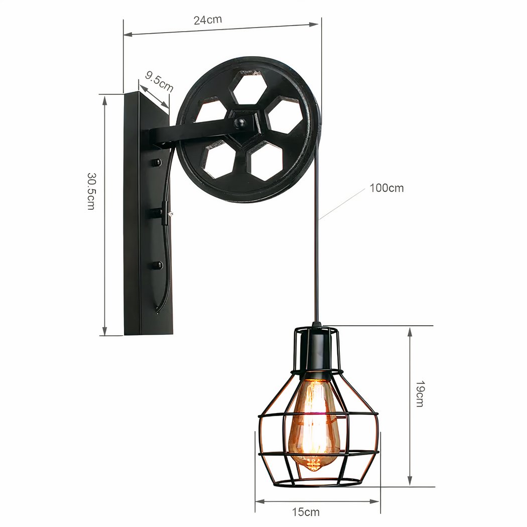 Diese Wandleuchte ist ein wahres Meisterwerk des Designs und wird Ihrem Zuhause einen rauen und originellen Touch verleihen. Der Metallkäfig, der als Lampenschirm dient, und der Flaschenzug erinnern an alte Fabriken und Werkstätten und sorgen für einen ausgesprochenen Industrie- und Vintage-Stil.
