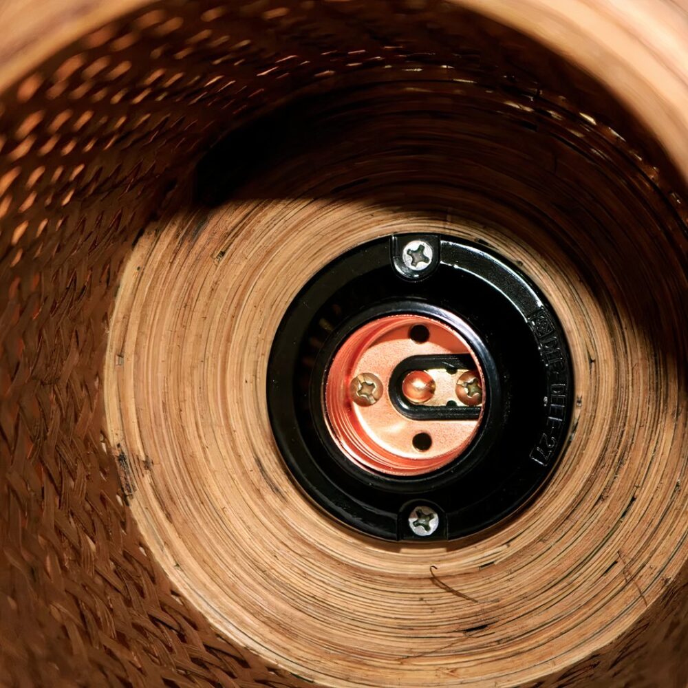 Dank ihres traditionellen Designs wird sich diese Wandleuchte aus Bambus harmonisch in Ihre Feng-Shui- oder rustikale Einrichtung einfügen und Ihrem Raum einen Hauch von Authentizität und Charakter verleihen.