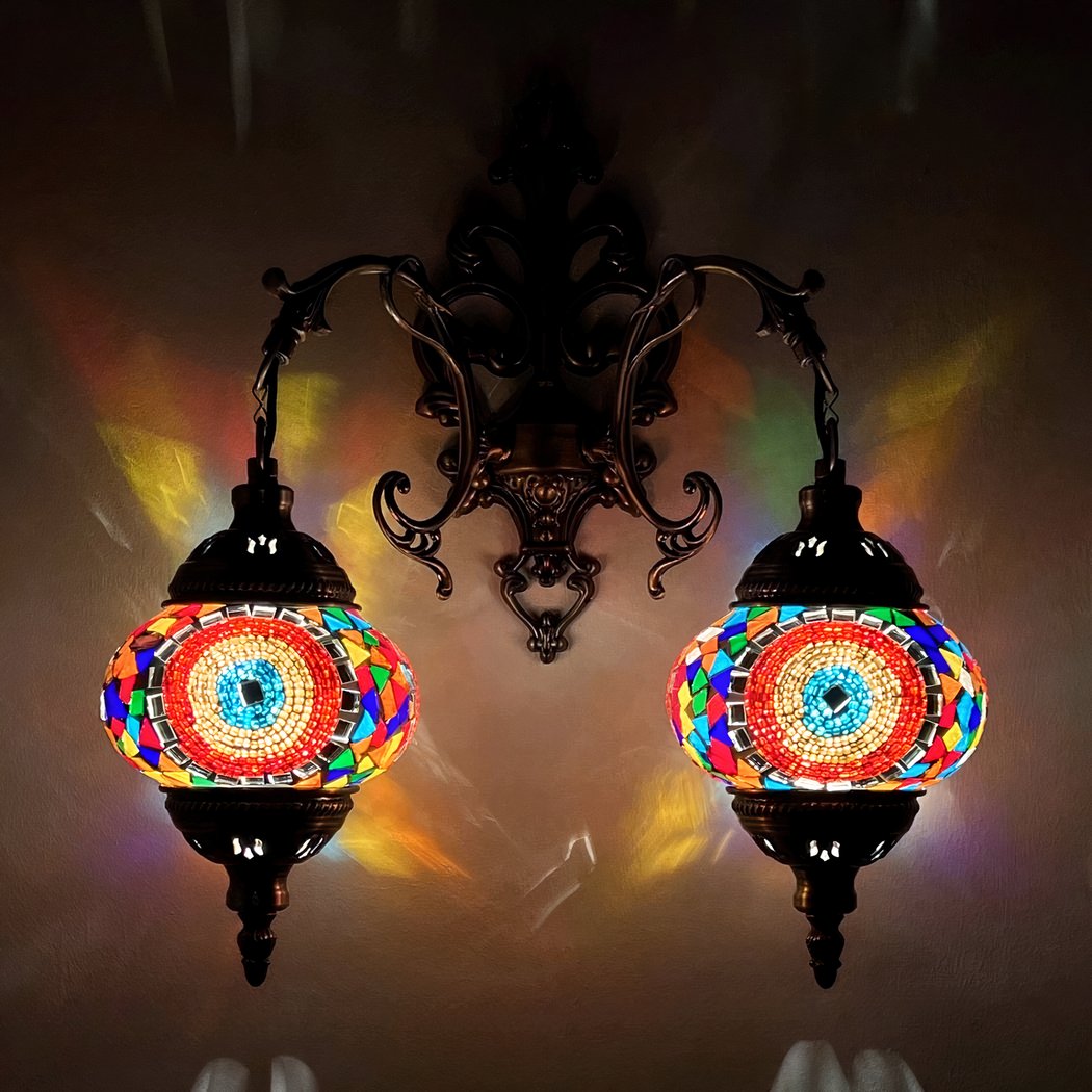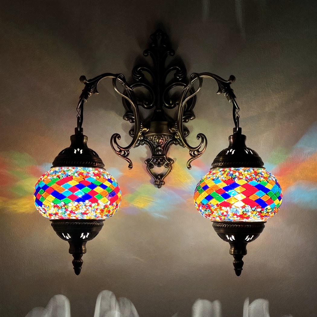 Gönnen Sie sich ein außergewöhnliches Lichterlebnis mit unserem neuen Sortiment an zweiköpfigen Wandleuchten. Die perfekte Kombination aus Tradition und Moderne. Jedes Modell ist ein Kunstwerk, das Ihren Raum mit erhabenen Farben und bezaubernden Mustern erhellt. Die Leuchten sind in vier Varianten erhältlich und schaffen eine magische Atmosphäre, die sich perfekt zum entspannten Lesen oder für gemütliche Stunden mit Freunden eignet.