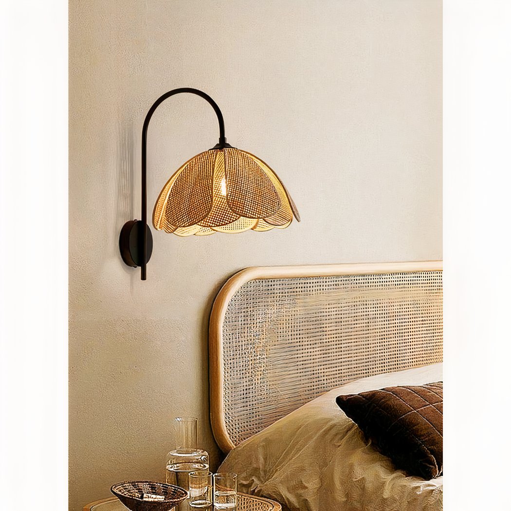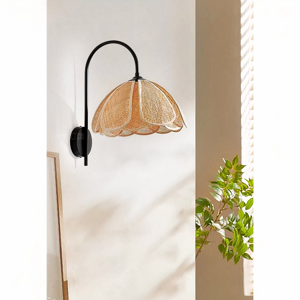 Rustikale Wandleuchte aus Rohrgeflecht mit einer Blumenform