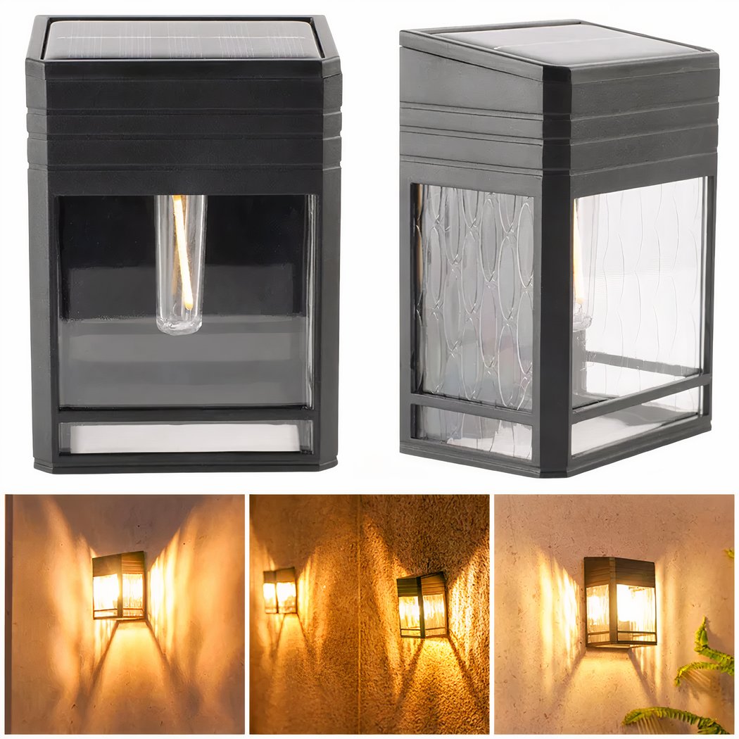 Diese Solar-Wandleuchte ist eine Leuchte mit klassischem, aber elegantem Design, die Ihrem Außenbereich einen modernen Touch verleiht. Durch ihre rechteckige Form und das transparente Glas ist die Glühbirne im Inneren sichtbar, was Ihrem Außenbereich eine ästhetische Dimension verleiht.